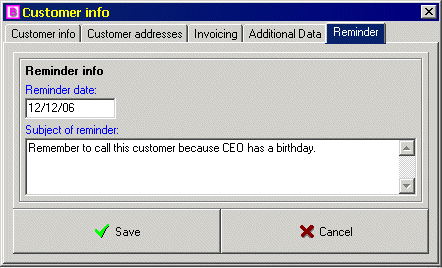 Customer-specific reminders can be entered into the program. Every time the program is started, the system