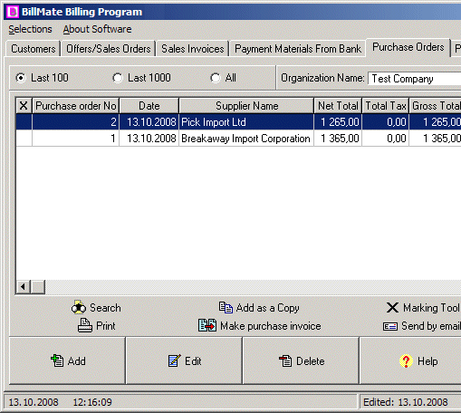 It is possible to insert purchase orders to the system. Program can add automatically all default information of suppliers to the